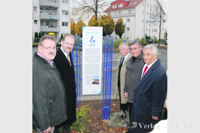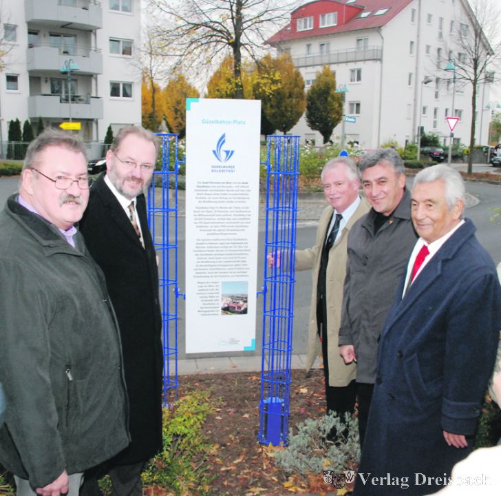 Die Tafel wurde am vergangenen Freitag enthüllt, freudiger Anlass war die offizielle Namensgebung des (kreiselähnlichen) Platzes in der Rheinallee, der fortan „Güzelbahce-Platz“ heißt. „Unsere Kreisel bilden nun eine Achse der Freundschaft“, meinte Bürgermeister Michael Antenbrink während der kleinen Feierlichkeit, der auch sein türkischer Amtskollege Mustafa Ince beiwohnte. Da es bereits einen Pérols- und einen Pyskowice-Kreisel gebe, sei es nur folgerichtig, dass der Name des dritten Verkehrsknotenpunktes Güzelbahce-Platz laute. Die türkische Delegation fühlte sich sehr geehrt und versprach, eine Parkanlage ihrer Heimatstadt nach Flörsheim zu benennen.