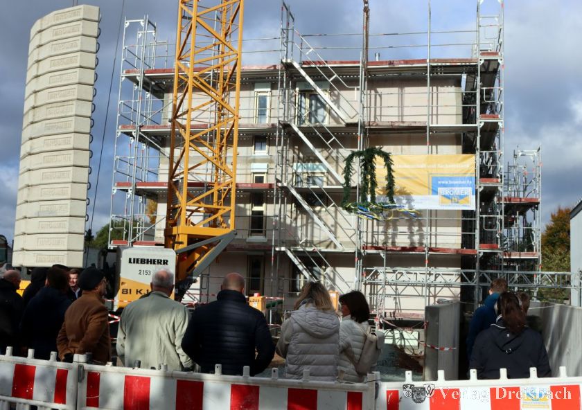 Das Projekt ging bisher schnell voran: Erst im April hatte der Aushub auf der bisherigen Rasenfläche nördlich der B519 begonnen, Mitte August begannen die Maurerarbeiten. Nun also versammelten sich Repräsentanten der beteiligten Unternehmen, Stadtverwaltung und Politik an der Baustelle, um das unvermeidliche Richtfest mit Kranz und Zimmermannsspruch zu feiern – während die Arbeiten im Gebäude weiterliefen.
