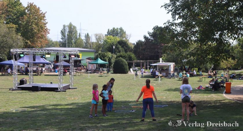Am Samstag sorgte „Rolls Toys“ am Nachmittag für die Animation der Kinder. Das ist ein Wiesbadener Unternehmen, das für Veranstaltungen Spielmaterial und Animationskünstler zur Verfügung stellt und in diesem Fall den kleinen Flörsheimerinnen und Flörsheimern Angebote zum Mitmachen bot. An den Abenden spielten die Bands „High Knees“ und Duo Bazoo“ auf einem kleinen Bühnenaufbau inmitten der Wiesenfläche.