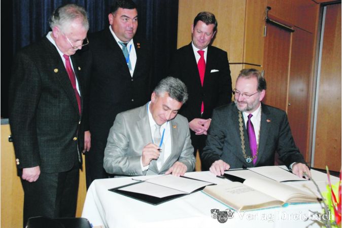 Die „Hochzeitsfeierlichkeiten“ setzten sich am Freitagabend mit einem festlichen Empfang in der Stadthalle fort. Wie es bei einer türkischen Hochzeit üblich ist, wurde zum Essen Raki gereicht und anschließend die Tanzfläche im Nu erobert. Zunächst jedoch begrüßte Stadtverordnetenvorsteher Wolfgang Odermatt die rund 100 Festgäste. Bürgermeister Michael Antenbrink erinnerte in seiner Ansprache auch noch einmal an die Probleme, die es im Laufe der Jahre immer wieder gegeben habe. Dem Engagement des Freundeskreisvorsitzenden Anton Geisinger sei es zu verdanken, dass viele Bedenken aus dem Wege geräumt werden konnten. Rund 650.000 Türken seien einst aufgrund des Anwerbeabkommens 1961 nach Deutschland gekommen, mehr als 2,5 Millionen Türken, zum Teil in dritter Generation, würden gegenwärtig in unserem Land leben. „Aus dem Wirtschaftsleben sind sie gar nicht mehr wegzudenken“, meinte Antenbrink, der auch davon überzeugt ist, dass Integration keine Angelegenheit sei, die man mit Gesetzen ordnen könne, es sei vielmehr eine Frage des Verständnisses, was aber nicht nur sprachlich gemeint sei. Zur Erinnerung an den bedeutenden Schritt in der Verschwisterungsgeschichte überreichte Bürgermeister Antenbrink eine Skulptur mit dem Logo der Stadtverwaltung, die ab sofort im Amtszimmer von Bürgermeister Ince ihren Platz finden wird. Im Gegenzug erhielt Antenbrink ein Buch über Mustafa Atatürk, den Begründer der modernen Türkei. Die Freundeskreise Pérols und Pyskowice bekundeten ihre Zustimmung zur dritten Partnerstadt ebenfalls mit Gastgeschenken. Der immer lächelnde Bürgermeister Ince bedankte sich mit sehr einfühlsamen Worten. „Wenn ich nach Hause kehre, fühle ich mich, als würde ich meine Familie hier zurücklassen“, so Ince. Ein weiteres Grußwort sprach Refik Basdere, Vizekonsul des türkischen Generalkonsulats Frankfurt. Er betonte, dass Freundschaften durch menschliches Mitgefühl und Solidarität genährt würden und empfahl, die Beziehungen in vielerlei Hinsicht zu vertiefen. Grüße des Landes Hessen entsendete Dr. Michael Borchmann, Leiter der Abteilung Europa und Internationale Angelegenheiten. Er berichtete von der neuen Partnerschaft Hessens mit der türkischen Provinz Bursa und gab weitere Beispiele für Zusammenarbeitsmöglichkeiten. So hospitiere beispielsweise eine türkische Landesbeamtin in Wiesbaden, die Provinz stelle sich beim nächsten Hessentag vor, zudem plane man einen Wirtschaftstag und den Ausbau von Schul- und Universitätspatenschaften. „In der Popwelt haben wir uns längst angeglichen, da wird es auch in anderen Bereichen gelingen“, zeigte sich der Vertreter Hessens zuversichtlich.