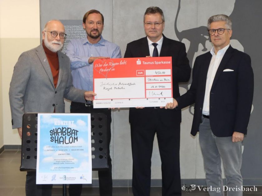 Gebeten wurde allerdings um Spenden für zwei Zwecke: Die musikalische Arbeit am Gymnasium und ein Lernförderzentrum in der israelischen Kleinstadt Kirjat Malachi sollten unterstützt werden. Nun übergaben CJZ-Vorständler Fanz Kroonstuiver, Schulleiter Klaus Hartwich und Musiklehrer Bernhard Frank einen Scheck über 450 Euro an Nathan Jagoda vom Verein Jüdischer Nationalfonds. Der betreibt eines seiner vier deutschen Büros in Frankfurt. Der Fonds mit Hauptsitz in Jerusalem betreibt das Lernförderzentrum in der 25.000-Einwohner-Stadt Kirjat Malachi, südöstlich von Tel Aviv gelegen. Es unterstützt Kinder und Jugendliche, zumeist aus schwierigem sozialen Umfeld, mit Nachhilfeangeboten und Musikunterricht.