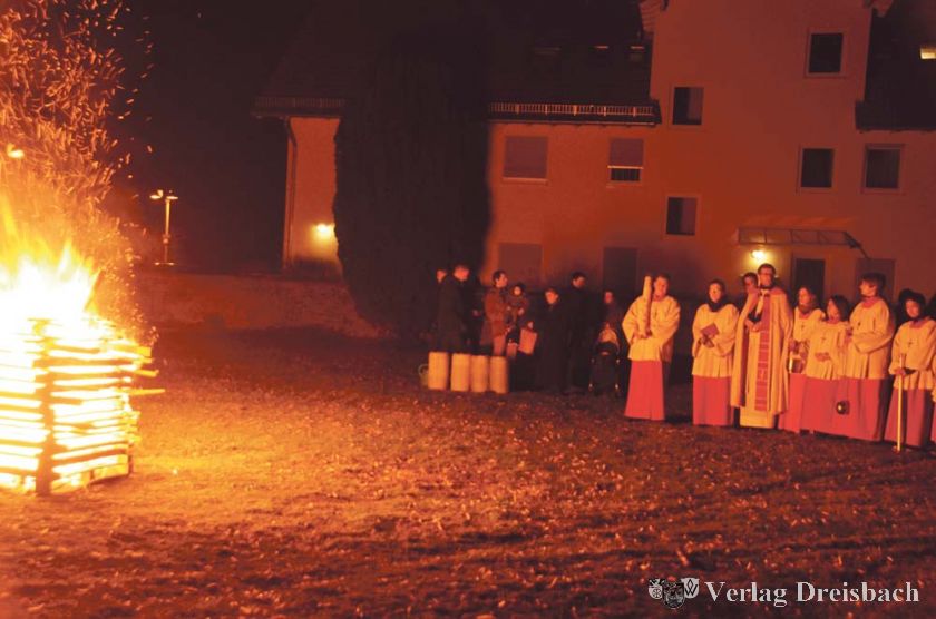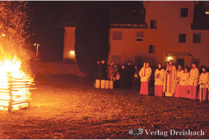 Gemeindereferent Michael Frost erläuterte die Galluskerze, die ein rotes Kreuz mit zerbrochener Hostie und einem Labyrinth zeigt. „Das Labyrinth führt zur Mitte des Glaubens, ist Zeichen des Aufbruchs und der Hoffnung“, so Frost. Für das Helferteam des Laurentius-Münch-Hauses symbolisiert die Kerze den Anfang und das Ende der Zeit und so sehen die Helfer in der Kerze einen Begleiter für das gesamte Jahr. Bei der evangelischen Gemeinde haben Jugendliche der Konfirmanden-Teamer-Gruppe die neue Osterkerze gestaltet. Ihnen war das Bibelwort für 2013: „Wir haben hier keine bleibende Stadt, sondern die zukünftige suchen wir.“ (Hebräerbrief 13,14) Vorbild. Die Jugendlichen wollten Zusammenhalt und Vertrauen mit ihrer Gestaltung ausdrücken. Nach der Entzündung aller Kerzen trennten sich die Konfessionen und mit den brennenden Kerzen wurden das Osterlicht in die Kirchen getragen.