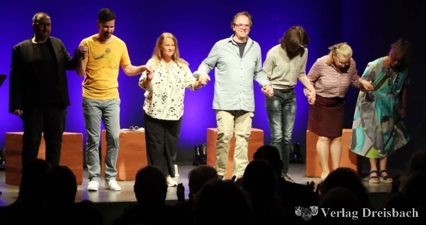 Die Schauspieler spielten mit Textkarten in der Hand, was nicht die Idealvorstellung einer Theaterstücks ist, wie Regisseurin Luzia Platt erläuterte, aber unvermeidlich war. Die Vorbereitungszeit war kurz, die Akteure gehen Berufen nach und haben Familien, und nicht zuletzt ist das FAT mittendrin in der Vorbereitung des neuen Stückes „Schiff ahoi“. Das wird im November auf die Bühne kommen, und das ist nicht mehr lange hin. Die Zuhörer in der gut gefüllten Kulturscheune durften die einzelnen Mitwirkenden mit Einzelapplaus würdigen. Dabei waren auch als Debütant auf der FAT-Bühne Maximilian Sonner, der sich vom Pult aus mit Klingelton einige Male mit Anmerkungen einbrachte, sowie Lukas Platt. Christian Kunesch vom Kulturamt der Stadt erhielt von der Regisseurin ein Sonderlob: er zeichnete für die Technik verantwortlich und baute auch noch die Bestuhlung auf.