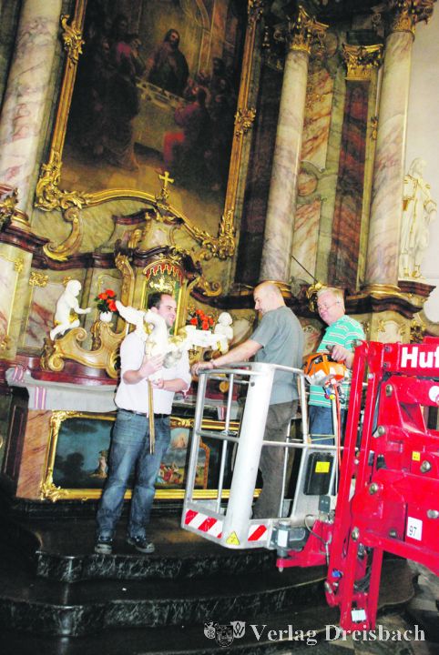 FLÖRSHEIM (drh) - Aufmerksame Kirchgänger werden das Verschwinden des Heiligen Gallus und des Heiligen Bruno am Hochaltar schon bemerkt haben. Am Donnerstag hievte ein Teleskopkran die mannsgroßen Statuen von ihren Stammplätzen am Altar, um ihnen die Reise in die Restauratorenwerkstatt von Georg Pracher in Würzburg zu ermöglichen. Zwei der insgesamt vier Figuren (Heiliger Sebastian und Heiliger Rochus) sind bereits restauriert, sodass nun auch der Namenspatron des Gotteshauses in den Genuss der Säuberung und Aufarbeitung kommen darf.