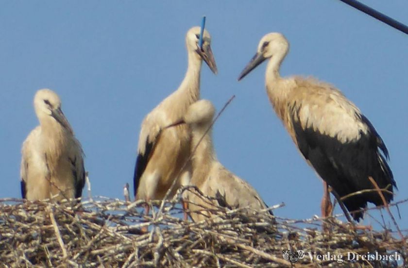 Und siehe da: Der blaue Stab lag – deutlich sichtbar – im Nest neben den Jungtieren. Offensichtlich konnte sich der Ärmste selbst davon befreien. Seinen Eltern traut Zürn eine solche intellektuelle Leistung nicht zu.