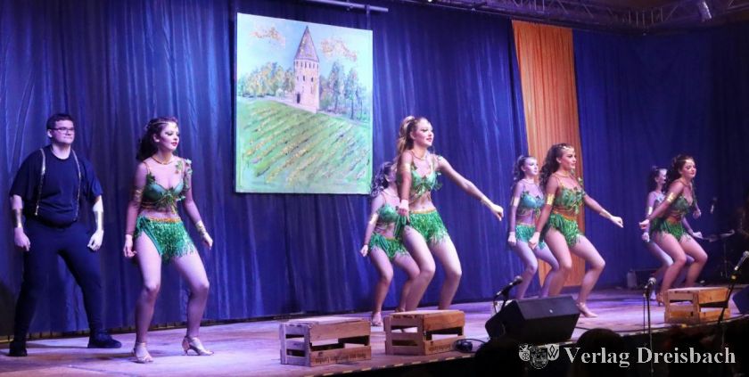 Nicht weniger als fünf Tanzformationen weist der Gesangsverein auf. Beginnend mit den „Tanzmäusen“, die trotz des Titels „Kölle Alaaf“ natürlich Wickerer Beine schwangen (Leitung: Mirja Löbbers-Remsperger) und gefolgt vom Nachwuchsballett als „Special Agents“ (Tammy Wenzler und Tamina Scholl), war im ersten Sitzungsteil auch die neue Formation „Ballett Saphire“ (Chantal Simon und Lucy Richter) zu sehen. Mit einem Gemälde vom Wickerer Weinberg samt Flörsheimer Warte darauf im Hintergrund sowie Weinkisten am vorderen Bühnenrand tanzten die sieben jungen Damen in grünen Kleidern einen geradezu edelsteinigen Tanz. Weinmajestät Magdalena Anthes durfte den Auftritt als aktives Mitglied der Formation ansagen.