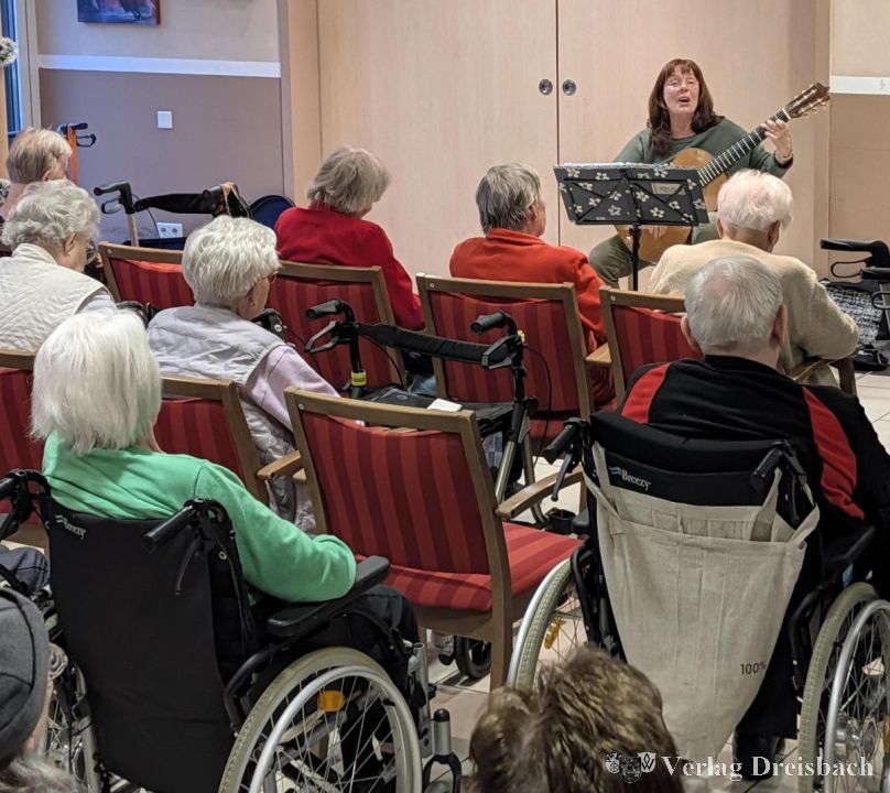 Mit bekannten Melodien und viel Gespür für ihr Publikum hat Britta Kluin in der Seniorenresidenz Eduard Schwerzel an der Dalbergstraße für einen musikalischen Nachmittag gesorgt. Bei einem Schlagerkonzert am Dienstagnachmittag mit Gitarre und Gesang nahm sie rund 25 Bewohnerinnen und Bewohner mit auf eine Reise durch mehrere Jahrzehnte deutscher Musikgeschichte – zum Mitsingen, Mitklatschen und Erinnern.