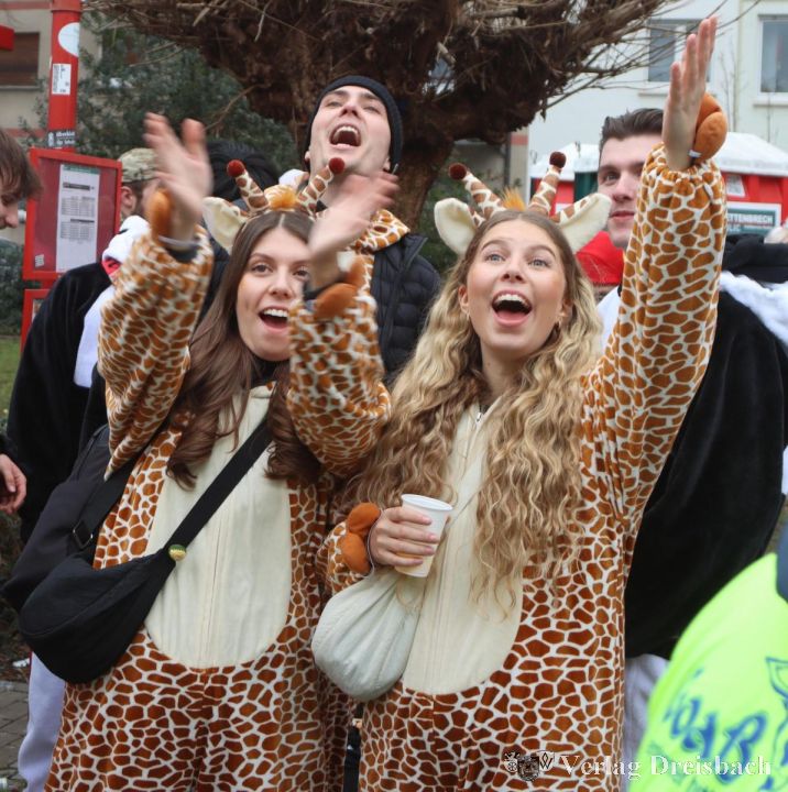 Fängerinnen im Doppelpack: die beiden Damen im Wildtierkostüm strecken sich dem anbahnenden Regen Wurfguts entgegen.