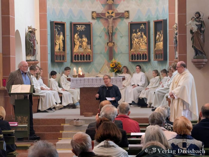 Besonders berührend waren die Rückblicke langjähriger Wegbegleiter der Gemeinde. Rosi Reinelt, die von 1971 bis 2007 die Kindertagesstätte leitete, und Pfarrer Lorenz Eckardt, der 15 Jahre in Weilbach wirkte, überreichten gemeinsam ein Jubiläumsgeschenk: eine reich bebilderte Broschüre über die Kunstwerke von Thomas Reinelt. Der gebürtige Weilbacher Künstler (1950–2022) hatte Maria Himmelfahrt zeitlebens als seine religiöse Heimat empfunden.