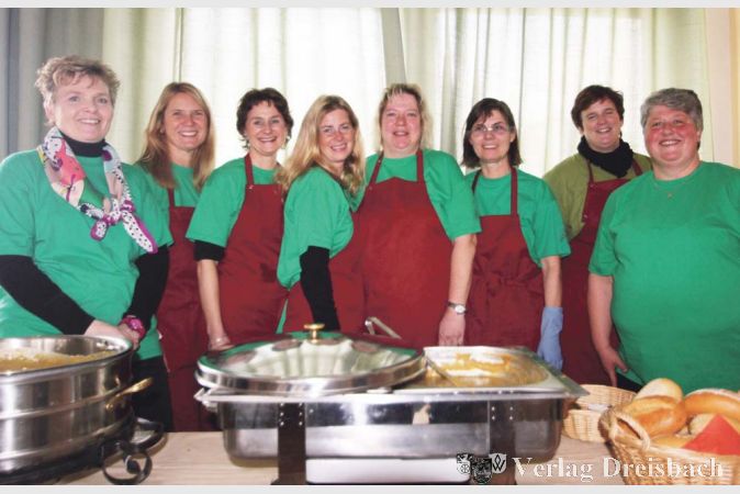 Für den „großen Erbsensuppentag“ traf sich das „Erbsensuppen-Team“ von acht Frauen und einem Mann schon im August zur Planung. Am Tag vor dem großen Suppenessen wurden auf dem Wochenmarkt alle Zutaten frisch – außer natürlich der Erbsen, die sind ja getrocknet – eingekauft, die in eine gute Erbsensuppe gehören: Lauch, Sellerie, Kartoffeln, Zwiebeln und Majoran. Dazu kamen dann noch Speck, und daraus wurden etwa 120 Liter Suppe gekocht. Am Erbsensuppensonntag konnten die Gäste dann einen Teller Suppe und ein Paar Würstchen für 5 Euro kaufen und an den langen Tischen im Pfarrheim zusammen verzehren. Dabei durfte sich jeder, wie immer, so viel Suppe nachholen, bis er satt war. Selbstverständlich wurden auch in diesem Jahr wieder Kuchen gespendet und auch eine Tombola war wieder ausgerichtet worden, alles für einen guten Zweck.