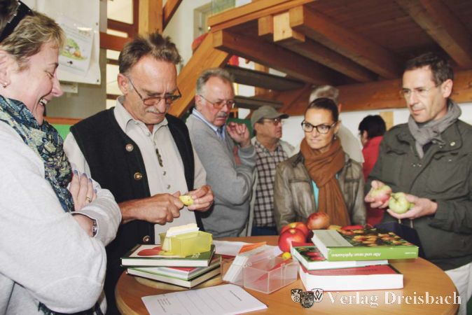 Angesichts der vielen verschiedenen heimischen Apfelsorten bekam offenbar der eine oder andere Apfelmarktbesucher auch Lust darauf, selbst solche schmackhaften Prachtexemplare zu ernten. „Wo kriegen wir denn einen Apfelbaum hier aus der Gegend her?“, fragte Miriana Prag den Apfelexperten. „Am besten fragst du da bei Barbara Helling vom Streuobstwiesenverein“, war die Auskunft, „sie ist auch hier auf dem Markt unterwegs, bestimmt kommt sie nachher auch noch mal hier vorbei!“