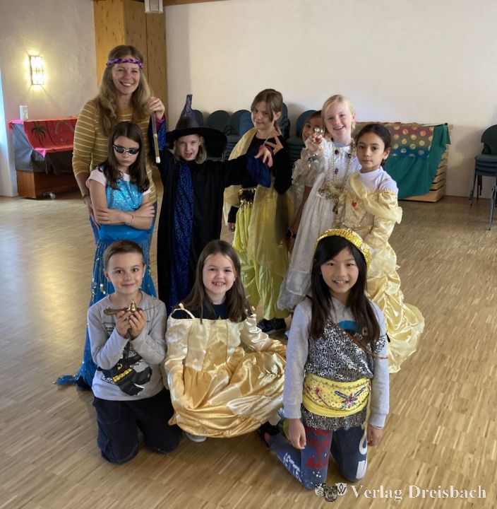 Ebenso wurde die Kreativität der Schülerinnen und Schüler beim Theater Workshop angeregt. Petra Schall leitete den Workshop. Sie kommt aus Hofheim und bietet hobbymäßig das Theaterspielen für Kinder an. Die Kinder bearbeiteten das Stück „Aladin und die Wunderlampe“. Petra Schall hatte einen ganzen Koffer voll glitzernder Kleidung mitgebracht. Das Theaterstück wurde mehrmals mit wechselnden Rollen aufgeführt. „Jeder möchte natürlich die Prinzessin sein“, schmunzelte Petra Schall. Allerdings waren die Kleider der Hofdamen mindestens genauso prächtig wie das Gewand der Prinzessin. Durch die wechselnden Rollen konnte jede der kleinen Schauspielerinnen (es gab nur einen Schauspieler) sich in unterschiedlichen Kostümen und Rollen ausprobieren und auch mal als Aladin, Flaschengeist oder Zauberer auftreten.