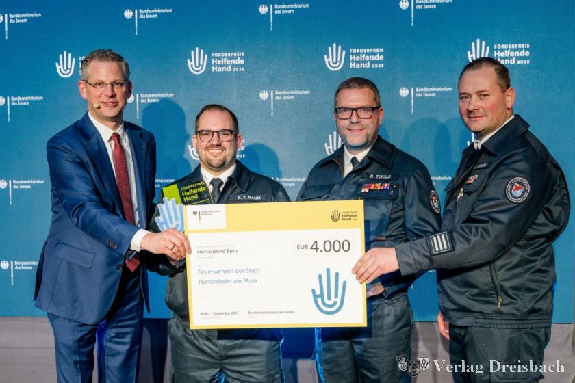 Beim bundesweiten Förderpreis „Helfende Hand“ – der höchsten Auszeichnung des Bundes für ehrenamtliches Engagement im Bevölkerungsschutz – erreichten die Hattersheimer Feuerwehren den 3. Platz in der Kategorie "Innovative Konzepte". Besonders bemerkenswert: Das Hattersheimer Projekt wurde aus fast 400 eingereichten Bewerbungen ausgewählt und von der Fachjury unter die besten Konzepte Deutschlands eingestuft. Ausgezeichnet wurde die stadtweite Kampagne „Bist Du bereit für den Notfall?“, die die Bevölkerung durch kontinuierliche, verständliche und niedrigschwellige Kommunikation zur eigenständigen Notfallvorsorge befähigt.