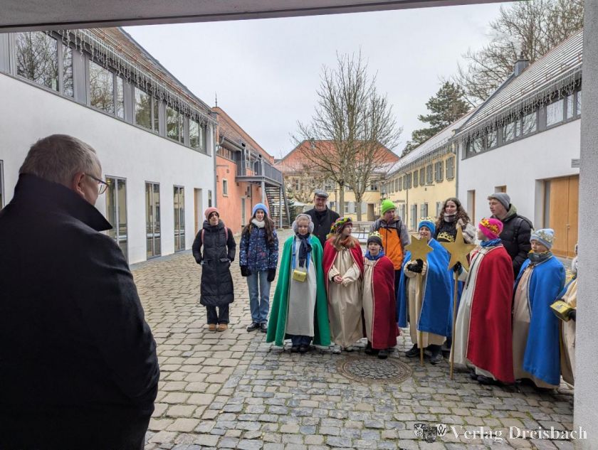 Bürgermeister Schindling lobte die dargebotene Sangeskunst und berichtete den Kindern kurz von eigenen Kindheits- und Jugenderinnerungen als Sternsinger, wie der zu seiner Zeit üblichen Zugabe in Form des Lieds "Stern über Bethlehem, zeig uns den Weg", bevor er den Sternsingerinnen und Sternsingern für ihren Besuch herzlich dankte und natürlich auch die mitgebrachten Spendendosen mit einigen Scheinen füllte.