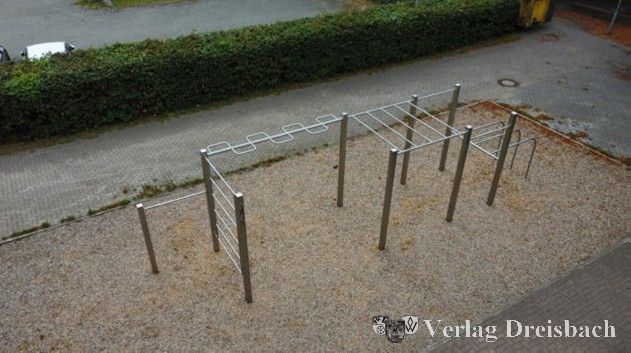 Die Bestandteile der wartungsarmen Anlage aus rostfreiem Stahl sind Monkeybar / Hangelleiter, Doppelbarren, vertikalen Sprossenwand und Snakebar / Schlangenleiter, dazu wird ein Aufsteller mit Beispielübungen aufgestellt.