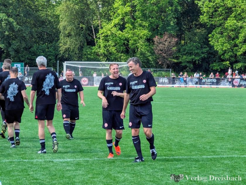 Nachdem gemeinsam "Im Herzen von Europa" lautstark angestimmt wurde, stürmte zunächst noch einmal die Mannschaft der gastgebenden Eintracht aus Hattersheim auf den Platz, unter tosendem Applaus genossen sie sichtlich ihr Bad in der Menge, das in eine fröhliche Ehrenrunde mündete. Ausführlich vorgestellt wurden zunächst die Amateur-Kicker der internationalen FFH-Auswahl, gefolgt von den ruhmreichen Größen aus der Geschichte der SGE. Beide Teams wurden von jungen Nachwuchsspielerinnen und -spielern aufs Feld geführt.