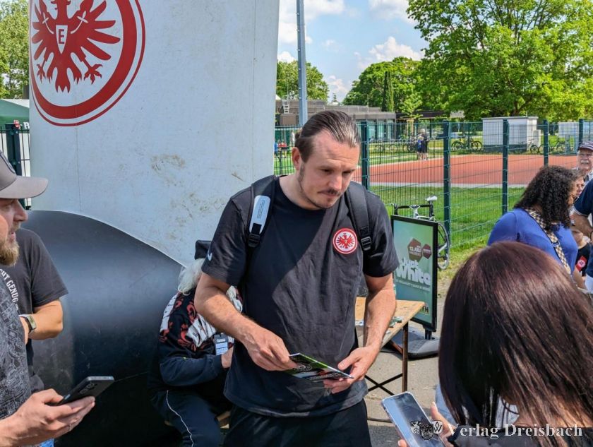 Schon lange vor dem Anpfiff um 15.30 Uhr strömten die Menschen in den Hattersheimer Sportpark und nutzten insbesondere mit dem beigeisterten Nachwuchs im Schlepptau das umfangreiche und spaßige Rahmenprogramm für die ganze Familie. Die Hattersheimer und die Frankfurter Eintracht waren gleichermaßen mit eigenen Merchandise-Ständen am Start, es gab eine Hüpfburg in Schwarz-Weiß-Rot, ein Gewinnspiel versprach ein signiertes Trikot von Eintracht Frankfurt als Hauptpreis, es gab einen Tischticker auf dem Rasen, einen Schussgeschwindigkeits-Test, eine Torwand und vieles mehr. Und das alles bei sommerlichem Wetter - man kann nur hoffen, dass nach dem wettermäßig arg durchwachsenen Wochenende möglichst viele Besucherinnen und Besucher rechtzeitig die akute Notwendigkeit eines Sonnenschutzes erkannt haben. Und natürlich wurde auch für das leibliche Wohl der vielen Fans mehr als ausreichend gesorgt.