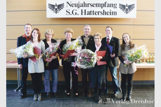 Mehr Grund zur Freude bot da die Ehrung langjähriger Vereinsmitglieder, die Dr. Axel Breuckmann mit seinem Amtskollegen Martin Grasser vornahm. Für 25-jährige Mitgliedschaft wurde im Rahmen des Neujahrsempfangs das Ehrenabzeichen in Silber an Beate Stern, Melanie Stern, Annemarie Jobst, Sigrid Diener, Isabelle Saul, Klaus Roth und Andreas Bruchenseifer verliehen. Annemarie Komac, Helmut Richter und Frank Rüttger halten der SG DJK Hattersheim bereits seit 40 Jahren die Treue und bekamen dafür das Ehrenabzeichen Gold überreicht. Mit einem Ehrenabzeichen in Bronze würdigte der Verein den „außergewöhnlichen persönlichen Einsatz“ von Jugendbetreuerin Tanja Herber, die sich seit 2005 im Jugendteam und als lizenzierte Kampfrichterin für ihre SG DJK engagiert.