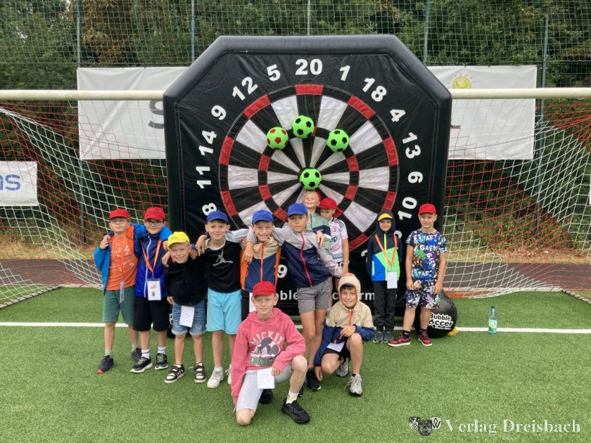 Eine sehr eifrige Gruppe fand man auf dem Fußballplatz des FC Germania Okriftel beim Soccer Dart. Ein Angebot, das man erstmals bei den Ferienspielen in Okriftel vorfindet. Die Kinder schießen mit Fußbällen auf eine überdimensionale Dartscheibe, an der die Bälle dank Klettbeschichtung „kleben“ bleiben. Die Punktwertung geht genauso wie beim echten Dartspiel.