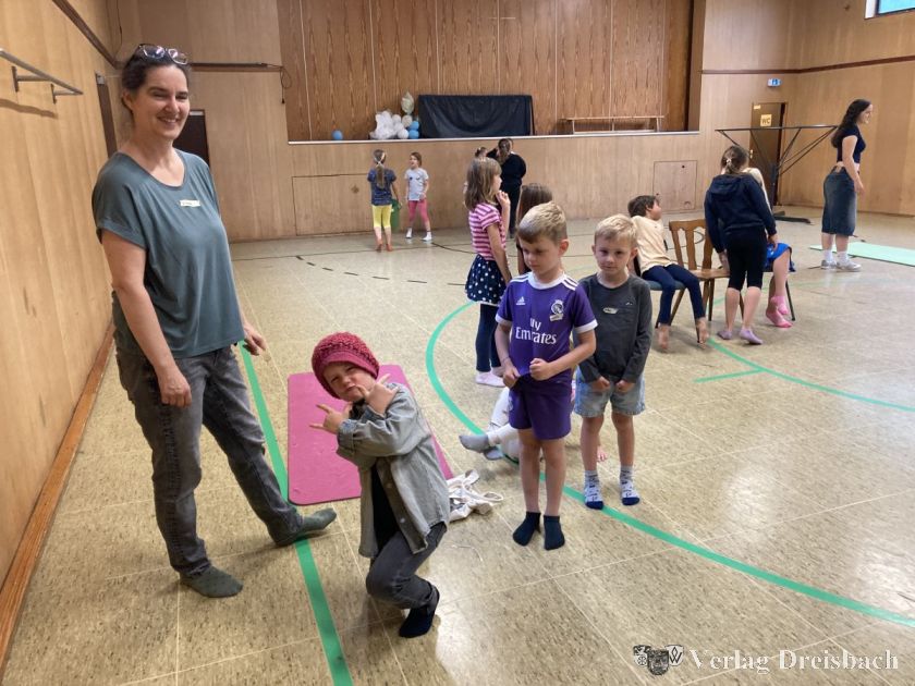 Der Theaterworkshop, der in der zweiten Ferienspielwoche am Montag begann, fand in der Turnhalle statt. Hier wimmelte es von fröhlichen Kindern. Für die professionelle Anleitung war Juliana Fuhrmann, eine ausgebildete Schauspielerin, engagiert worden. Es wird kein vorgegebenes Stück aufgeführt, sondern es ist Juliana Fuhrmann wichtig, dass die Kinder sich die Szenen selbst erarbeiten. Bei den Schauspielszenen geht es um Freundschaft und darum, dass man auch einmal Streit hat und dann wieder zueinander findet. Am ersten Tag lernte man sich kennen und es wurden zunächst kleine Szenen in Gruppen erarbeitet. Die Texte wurden improvisiert. Auch bei der Aufführung beim Abschlussfest soll eher wenig gesprochen werden, die kleinen Schauspielerinnen und Schauspieler sollen vielmehr ihren Körpereinsatz zur Darstellung benutzen. Bei der Schlussaufführung kann jedes Kind aus der Gruppe mitmachen, das Lust hat, es wird kein Kind gezwungen, das spontan nicht auftreten möchte. „Damit es nicht so ist wie in der Schule“, schmunzelt Fuhrmann.