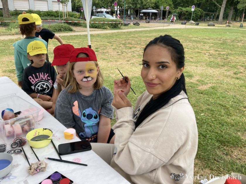 Beliebt war auch das Kinderschminken. Die Kinder wurden sehr gekonnt verschönt. Es entstanden wilde Tiger, Vögel oder Blumen. Aber auch sogar gemalte Spinnen dienten als Schmuck für das Gesicht. Hier wurden die Wünsche der Kinder berücksichtigt. „Wir verwenden antiallergische Farben, die speziell für das Kinderschminken geeignet sind“, erklärte eine der Betreuerinnen. Wasserfest ist die Farbe natürlich nicht. „Aber als Schutz vor dem Regen haben wir ja unsere Kappen“, bemerkte ein Mädchen sehr richtig.