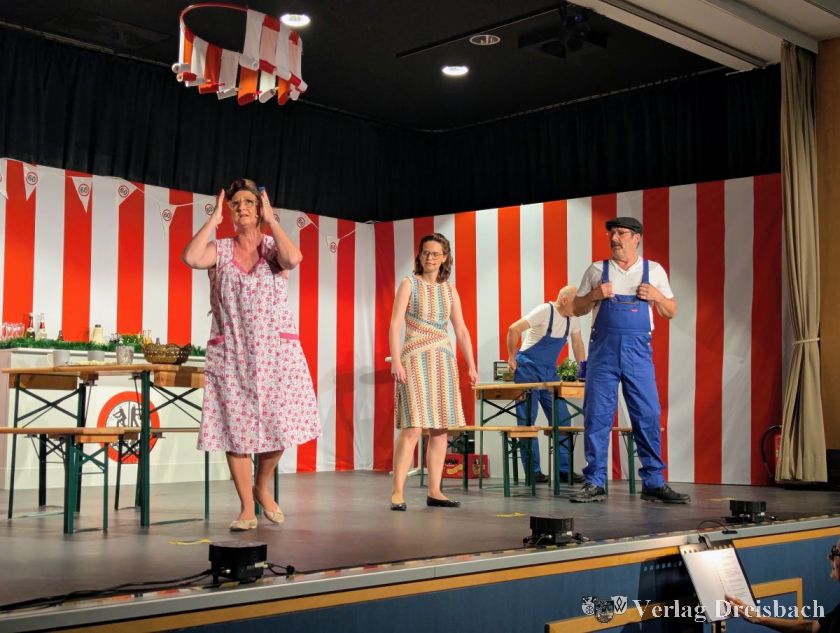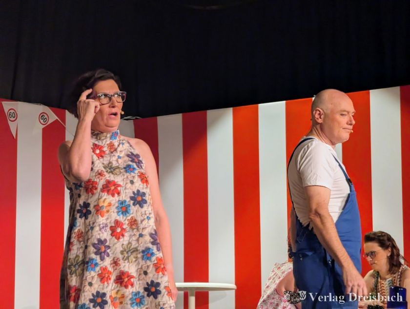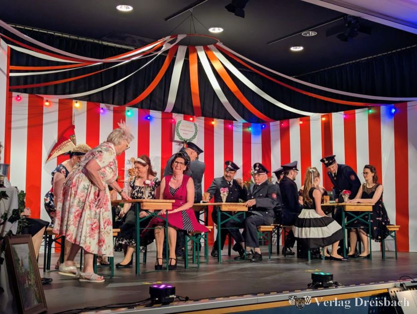 Als Schauplatz für "Friesennerz & Ballkleid" hatte die Drehbuchautorin Mary Gutmann das 60-jährige Jubiläum der Okrifteler Feuerwehr ausgewählt, das 1965 begangen wurde - und das Publikum sollte sich auch heute so fühlen, als wäre es ein Bestandteil der damaligen Feierlichkeiten. Entsprechend war das Haus der Vereine auch geschmückt, die Farben Rot und Weiß dominierten und die Zuschauertische harmonierten wunderbar mit der Szenerie auf der Bühne. Die begeisterten Premierengäste fühlten sich so tatsächlich ein gutes Stück weit in der Zeit zurückversetzt und "mittendrin statt nur dabei".