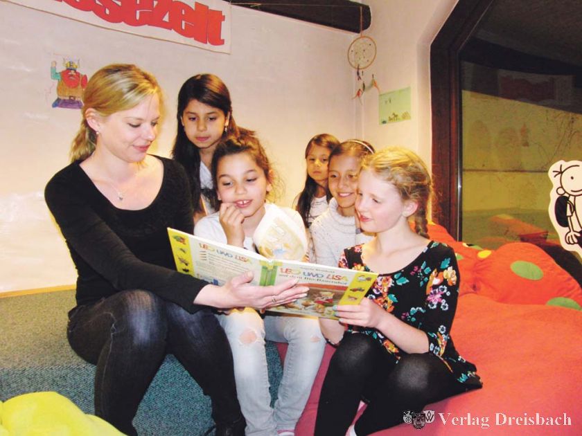 Annika Sommerfeld, stellvertretende Leiterin der Stadtbücherei, las den fünf Zuhörerinnen aus Angela Weinhold´s „Leo und Lisa – Auf dem Bio-Bauernhof“ vor. Erzählt wird die Geschichte von den Zwillingen Leo und Lisa, die ihre Ferien auf dem Bauernhof verbringen und in dieser Zeit viel über Nutztiere, Pflanzen und die tägliche Arbeit auf dem Hof lernen.