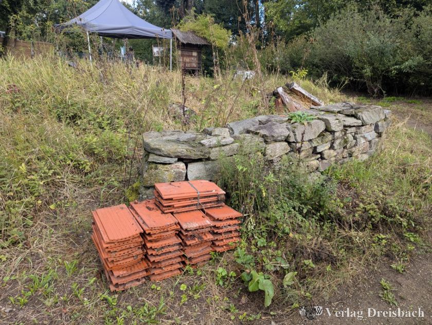 Eine kleine Hecke wurde entlang des Weges gepflanzt, ebenso diverse Sträucher im hinteren Bereich des Grundstücks. In der Mitte wurde ein kreisrundes Staudenbeet angelegt, im Randbereich wurde eine Wildwiese eingesät. Zudem entstand entlang des Rundweges eine fast sechs Meter lange und 70 Zentimeter hohe Bruchsteinmauer sowie ein Lehmhügel. Diese sollen - neben dem Wildbienenhotel - als Nistplätze dienen. Und das gerne auch für andere Insektenarten.