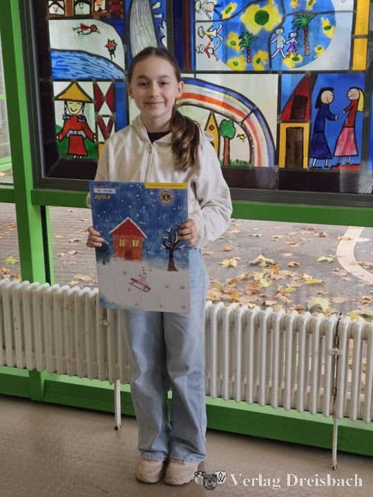 In der Lindenschule in Kriftel fand am Donnerstag, 23. Oktober, die offizielle Vorstellung des diesjährigen Adventskalenders des Lions Club Hattersheim-Kriftel statt. Wie in jedem Jahr wurde das Kalenderbild an einer örtlichen Schule gemalt. Wir danken daher den Kindern und Lehrkräften der Lindenschule für ihre Unterstützung. Ein besonderer Dank gebührt unserer Künstlerin des Jahres, der zehnjährigen Annika Setzer. Eigentlich wenig verwunderlich, dass sie – im Winter geboren – eine verschneite Landschaft gewählt hat: Ein rot erleuchtetes Haus zwischen sanft fallenden Schneeflocken, im Vordergrund eine mutige Schlittenfahrerin mit Schal und Bommelmütze, die einen verschneiten Abhang hinuntersaust. Die angewendete Schwammtupftechnik im Himmel mit zwei verschiedenen Blautönen verleiht dem Bild Lebendigkeit und Wärme zugleich.