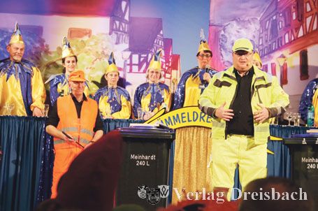 „Ei wo simmer dann hier? In Heinz Hildebrands Wohnzimmer?“ – zwei offenbar ortsunkundige Straßenkehrer schoben auf einmal unter großer Beachtung ihre schwarzen Mülltonnen in den Saal und beantworteten sich ihre Frage gleich selbst: „Nein, mir sinn im Taunussaal, aber irgend so ein Ganova oder so will den doch abreiße lasse? Abber da hat er die Rechnung ohne unsern Dicke gemacht!“ – „Was issen hier los? Heinz Hildebrand feiert sein 100. Geburtstag?“ – „Na, des sinn die Freidhof’sche Festspiele!“, spann sich der Dialog weiter, während die Herren mit ihren Tonnen schließlich auf der Bühne ankamen. Stefan Käck und Klaus Schindling unterhielten auch die Eddersheimer mit ihrem selbstironischen Zwiegespräch als „Karl und Erwin“ auf das Allerbeste. Bei den Späßen etwa zum Zeitpunkt der Wiedereröffnung der Stadthalle und bei den urkomischen Parodien – Erwin als Erster Stadtrat Spengler und Karl als Peter Maffay, Udo Lindenberg und als Grönemeyer – blieb kein Auge trocken.