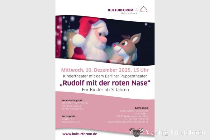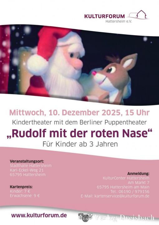 Im Rahmen des Kindertheaters präsentiert das KulturForum Hattersheim e. V. am Mittwoch, 10. Dezember, um 15 Uhr das zauberhafte Stück „Rudolf mit der roten Nase“ des Berliner Puppentheaters. Die Aufführung findet in der Stadthalle Hattersheim, Karl-Eckel-Weg 21, 65795 Hattersheim am Main, statt.