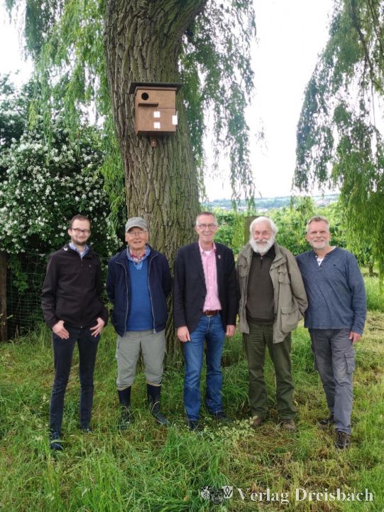 Bei strahlendem Sonnenschein wurde mit dem „Hauptsponsor“ des Vogelschutzteams, der Gemeinde Kriftel, offiziell der neue Steinkauz-Nistkasten eingeweiht. Da jede Krifteler Röhre nicht nur eine Nummer, sondern auch eine eindeutige Bestimmungsbezeichnung hat, wurde dieser Kasten vom Vogelschutzteam dem scheidenden Ersten Beigeordneten Franz Jirasek gewidmet - verbunden mit dem Dank für die langjährige respektvolle Zusammenarbeit.