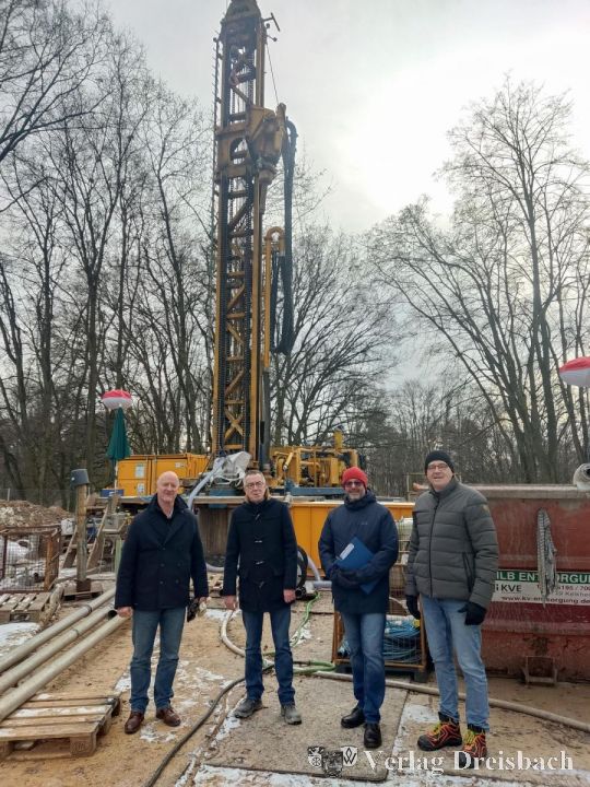 Sie erfuhren von Bauleiter Dirk Münstermann, Diplom-Hydro- und Umweltgeologe bei der beauftragten und in Kriftel ansässigen Firma HPC AG, dass alles nach Plan läuft, auch wenn an diesem Tag durch den Frost die Rohre eingefroren waren und nicht gearbeitet werden konnte. Nach Beendigung der Bohrung waren zuletzt in den 93 Meter tiefen Brunnen Filterrohre, dann rundherum Filterkies eingebracht und die Sperren zwischen den wasserführenden Schichten eingesetzt worden.