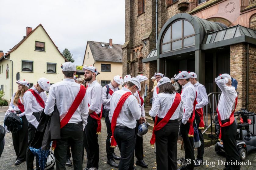 Mitten in der Saison befindet sich aktuell das Brass & Drum Corps Kriftel. Zwischen der Generalprobe zu den European Drum Corps Championships am vergangenen Freitagabend und eben jenem Wettbewerb an diesem Samstag ließ man es sich nicht nehmen, auch noch beim Krifteler Kerbeumzug mitzumarschieren. Und schließlich waren auch wieder die Rathausspitze, sprich: Bürgermeister Christian Seitz und der Erste Beigeordnete Martin Mohr zusammen mit dem Vorsitzenden der Gemeindevertretung Alexander Feist auf den Beinen, allesamt mit Bembel und Pappbechern in der Hand, um den Schaulustigen den ein oder anderen Schoppen einzuschenken.