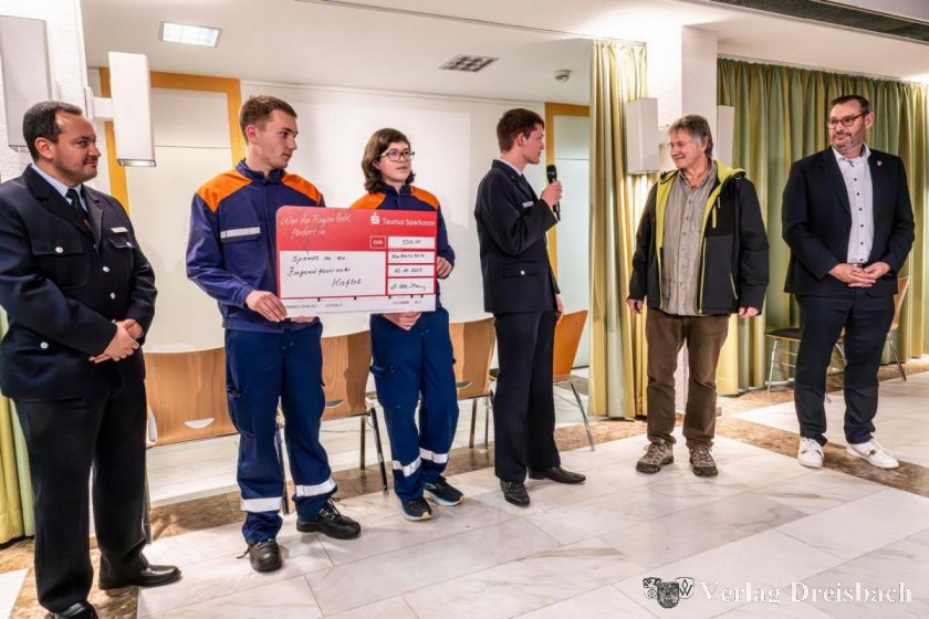 An zahlreichen Ausstellungswänden konnten Fotos bewundert und auch die übrig gebliebenen Enten vom Entenrennen abgeholt werden. Dr. Wolfgang Mazur vom Lionsclub Hattersheim-Kriftel nutzte die Feierstunde, um der Jugendfeuerwehr der Gemeinde Kriftel für ihre weitere Arbeit einen Spendenscheck über 500 Euro zu übergeben, als Dank dafür, dass die Mitglieder jedes Jahr beim Entenrennen die vielen gelben Gummienten im Schwarzbach aussetzen, betreuen und wieder „einfangen“.