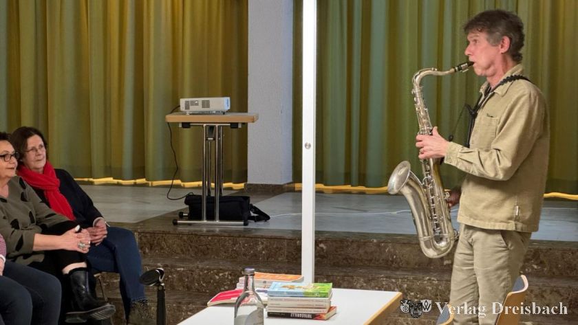 Schon der Auftakt machte klar, dass dieser Abend mehr sein würde als eine klassische Autorenlesung. Saxofonist Matthias Rüdiger sorgte mit live gespielten Stücken für einen atmosphärischen Einstieg, der perfekt zur Krimi-Stimmung passte und das Publikum sofort aufnahm. Dabei blieb es nicht bei Musik „von vorn“: Rüdiger bewegte sich spielend durch die Reihen und rahmte das Programm immer wieder musikalisch ein – ein Format, das die Lesung lebendig machte und hörbar begeisterte.