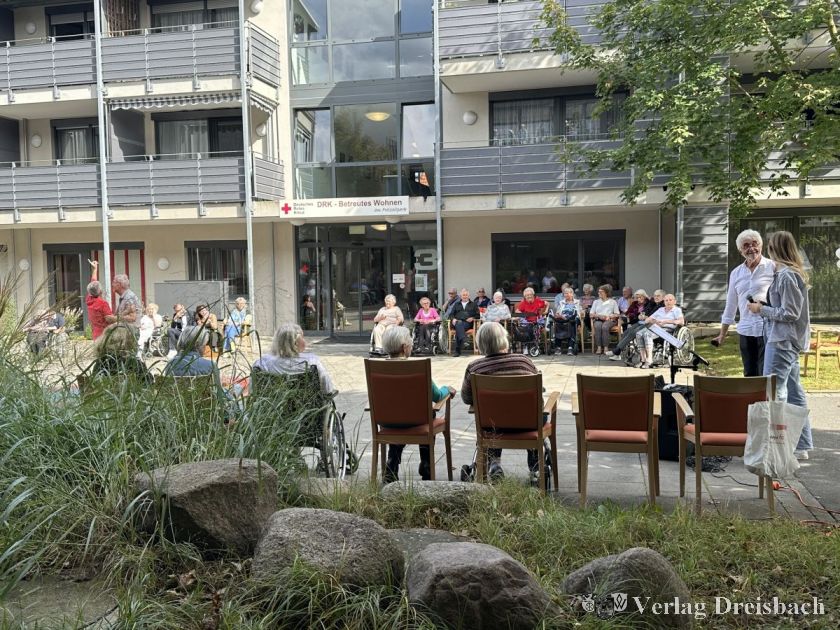 Der Wettergott spielt nicht immer mit, wenn auf dem Asphalt vor dem Kursana Domizil am Donnerstagnachmittag gesungen und getanzt wird. Doch der Regen tat der Stimmung Anfang September keinen Abbruch. Das Konzert wurde kurzerhand in den Saal des Hauses St. Sebastian verlegt. Hannelore Joisten, Stammgast beim musikalischen Nachmittag, nahm es mit Humor und sagte, vielleicht können wir die dunklen Wolken mit einem Regentanz vertreiben“.