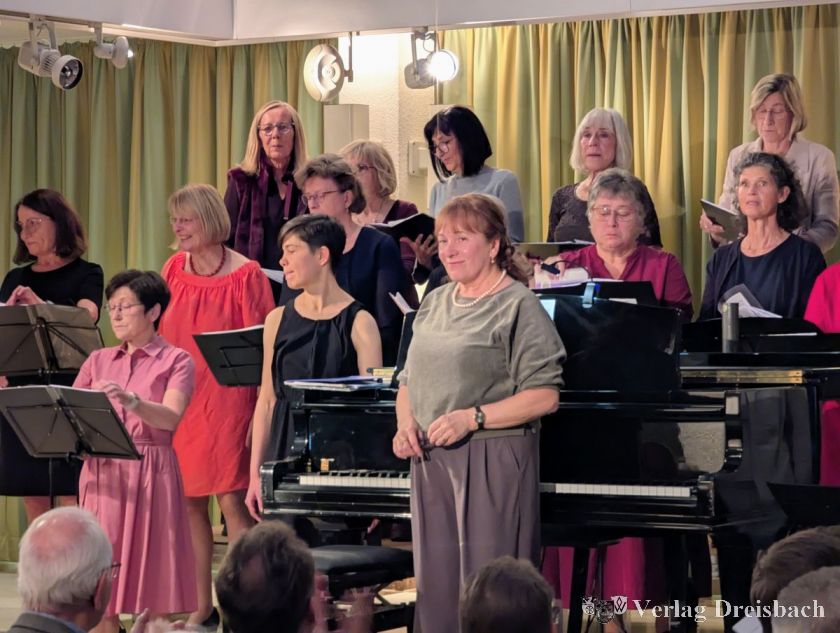 Gleichzeitig war aber auf dem Boden des Foyers vor der Bühne etwas weniger Platz für Stuhlreihen als sonst, und das aus einem gut erkennbaren Grund: Der große, schwarze Flügel stand diesmal auf einem Holzsteg, der von der Bühne herausragte. Svitlana Tulchiner am Klavier war somit näher am Publikum dran - und die vielen Chorsängerinnen hatten so die gesamte Bühne für sich.
