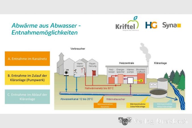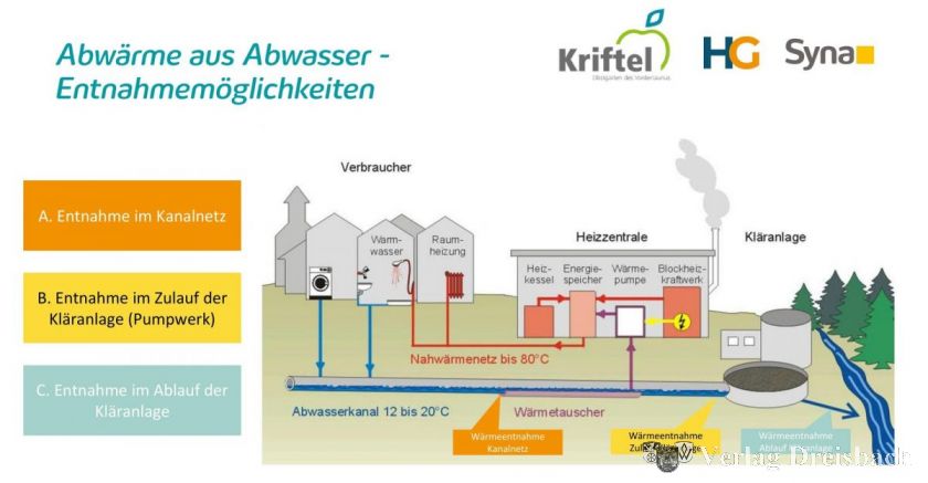 Die Abwassertemperatur kann vor und nach der Kläranlage entnommen werden - jedoch ist es für die Kläranlage selbst nicht so gut , wenn dies vor selbiger geschieht, deshalb macht man das meist nicht. Die Entnahme nach der Kläranlage könnte man aber tatsächlich intensiver prüfen, da Kriftel eben auch über ein eigenes Klärwerk auf hiesiger Gemarkung verfügt.