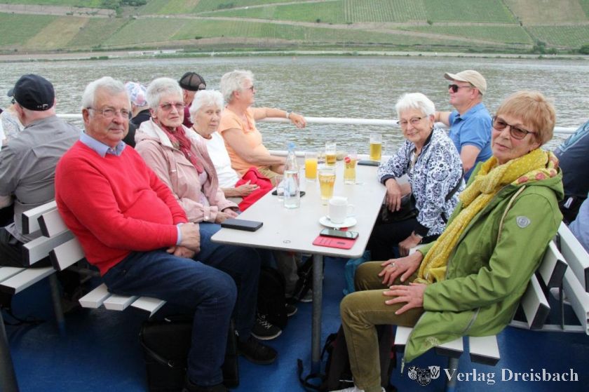 Nach so viel Natur und Romantik sollte es anschließend wieder um leibliche Genüsse gehen. Im Weingut Corvers-Kauter in Oestrich-Winkel gab es einen herzlichen Empfang durch die Chefin, die jedem einen kühlem Sekt kredenzte. Dies erfreute alle ebenso wie das wunderbare Ambiente, die vorzügliche Küche und natürlich das hervorragende Weinangebot. Beschwingt durch den guten Riesling wurde auch der Gesang immer besser und auf der Heimfahrt im Bus wurde der wunderschöne Tag in alter Tradition mit dem Lied "Kein schöner Land" abgeschlossen. Liesel Pörtner sprach allen Teilnehmerinnen und Teilnehmern aus dem Herzen, als sie im Namen aller dem AWO-Vorstand und den beiden Verantwortlichen des Reiseteams, Gerhard Mantel und Hartmut Keßler, für den so gelungenen Tag am Rhein in unserer schönen Heimat dankte.