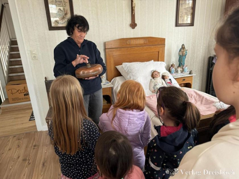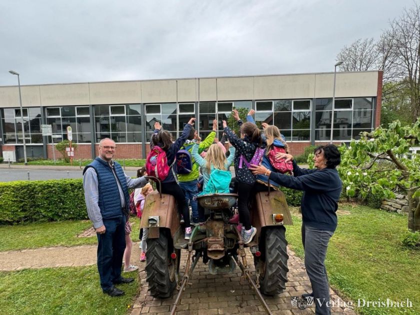 Brigitte Faller präsentierte kuriose Sammelstücke der Heimat- und Festwagengesellschaft im ehemaligen Wohnhaus, etwa eine fahrbare Kindertoilette. „Ist das ein Jumpsuit?“, wollte ein Kind wissen. In der Tat handelte es sich um Unterwäsche, die hinten aufgeknöpft werden konnte, wenn man rasch auf Toilette musste. Unbekannt war auch eine kupferne Wärmflasche, die mit Wasser gefüllt um 1900 auf dem Ofen vorgewärmt wurde. „Wo ist denn hier der Kühlschrank?“, wollte jemand wissen. „Der Kühlschrank war der Keller“, so Brigitte Faller. Ein Höhepunkt war, dass zum Schluss alle auf einen Traktor klettern durften. Die beiden Betreuer bedankten sich herzlich für den Vormittag und die Schülerinnen und Schüler verabschiedeten sich mit einem lauten „Danke schön“.