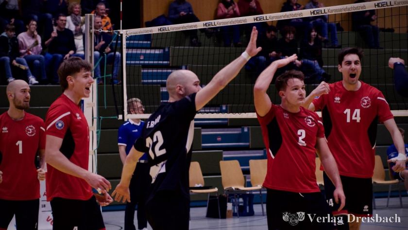 Dabei musste das Team von Trainer Klaus Hermann ein paar kritische Momente überstehen: Im ersten Satz mussten gleich drei Satzbälle abgewehrt werden, ehe man den ersten eigenen Satzball zur knappen Führung verwandeln konnte. Nach einem konzentrierten und entschiedenen zweiten Durchgang musste im dritten Satz dann Kapitän und Diagonalangreifer Sebastian Bock ausgewechselt werden, der nach einem Zusammenstoß mit Mitspieler Kester Rumke zunehmend Probleme mit seinem Oberschenkel hatte. Der dritte Satz ging in der Folge an die Sinziger.