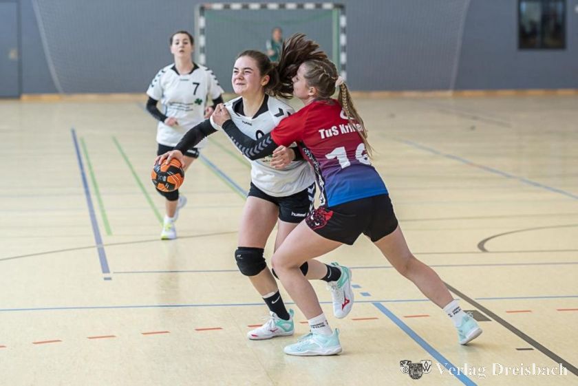 Wieder konnte die Mannschaft krankheitsbedingt nur mit acht Spielerinnen antreten. Die Gäste fanden gleich gut ins Spiel und führen bereits nach zwei Minuten mit 3:0. Doch davon ließen sich die jungen Kriftelerinnen nicht beeindrucken. In der Abwehr wurde besser verdichtet, so dass die großen und schnellen Gegnerinnen nicht mehr so leichtes Spiel hatten, sich durchzusetzen. So fand nicht mehr jeder Wurf sein Ziel. Im Angriff kam die TuS mit der offensiven Abwehr recht gut zurecht. Mit einem guten 1-gegen-1-Verhalten setzten sie sich immer wieder schön durch und konnten so sehenswerte Tore herausarbeiten und Strafen erzwingen. Der Halbzeitstand war hervorragend, und so war die Ansage in der Pause: durchatmen, Kräfte sammeln und noch einmal versuchen, in den folgenden 20 Minuten die gleiche Leistung abzurufen.
