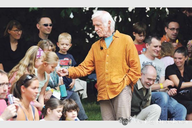 Fredrik Vahle genoss das Wiedersehen und die Rückkehr zur Villa Herrmann, wo er bereits früher Kostproben seiner Kinderlieder zum Besten gegeben hatte. Nur zu gerne mischte er sich unter die Jüngsten im Publikum, um sie zu animieren, gehören doch gerade Bewegungslieder mit Impulsen aus den Lehren von Tai Ji und QiGong zu seinem reichhaltigen Repertoire.