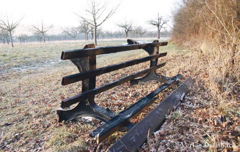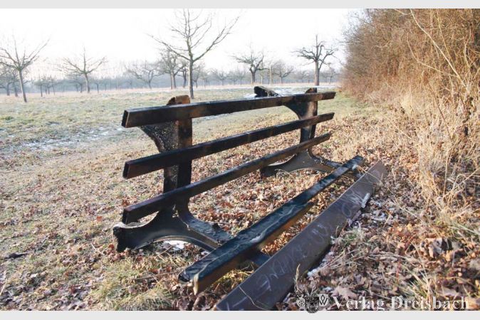 Wie es die Täter geschafft haben die Kunststoffsitzbank anzuzünden, die am Zugang der Neuaue steht, ist Guthmann ebenfalls ein Rätsel. Außer dem Metallgestell ist jetzt alles verschmort. „Der Unfug geht zu weit!“, hat der Ortslandwirt kein Verständnis für den Vandalismus. Immerhin sorgt die Gemeinde auf der Neuaue dafür, dass alte Obstbaumsorten erhalten werden. (Fotos: ast)