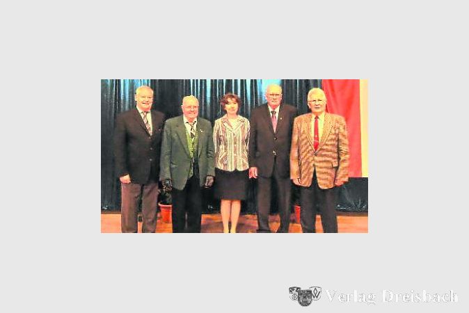 Das Bild zeigt (von links) Klaus Zahn, in Vertretung von Bürgermeister Reinhard Bersch, Friedel Christ, die 1. Vorsitzende Yvonne Barton, Herbert Brenner und den Abteilungsleiter Männerchor, Joachim Völling.