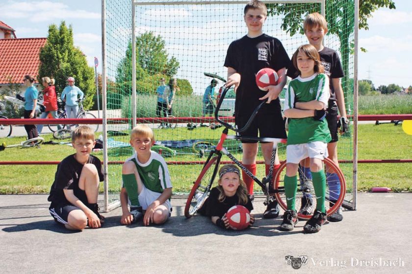 Neben Einradhockey, Kunstradfahren, Radartistik und Einrad-Freestyle, präsentierte sich auch die RSG Ginsheim mit Radball auf der Aktionsfläche vor der Riedhalle in Dornheim. Die Ginsheimer Nachwuchssportler hatten sichtlich Spaß dabei und versuchten sich auch selbst an den Radsportarten der anderen Vereine (v.l.): Christian Hübner, Fabian Bender, Partick Johannes, Thorsten Hübner, Justus Zinkant und Peter Johannes. (Foro: privat)