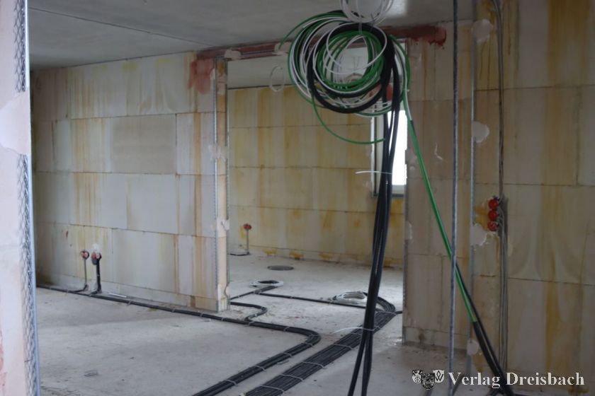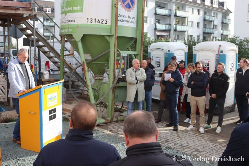 Das Projekt ging bisher schnell voran: Erst im April hatte der Aushub auf der bisherigen Rasenfläche nördlich der B519 begonnen, Mitte August begannen die Maurerarbeiten. Nun also versammelten sich Repräsentanten der beteiligten Unternehmen, Stadtverwaltung und Politik an der Baustelle, um das unvermeidliche Richtfest mit Kranz und Zimmermannsspruch zu feiern – während die Arbeiten im Gebäude weiterliefen.