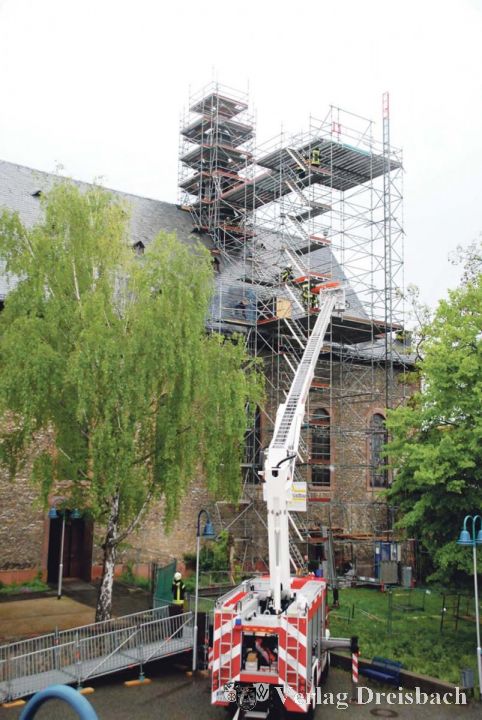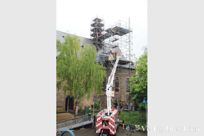 Nach dem Eintreffen der 21 Wehrleute am vermeintlichen Einsatzort verschafften sich die Gruppenführer zunächst einen Überblick über die Situation, schickten dann Wehrkräfte, die über einen Absturzsicherungslehrgang verfügen, ins Gerüst, um den Verletzten Erste Hilfe zu leisten und sie in die stabile Seitenlage zu bringen. Vom Boden aus konnten die Einsatzkräfte zunächst nur zwei Personen ausmachen, doch in gut 30 Metern Höhe lag die dritte Übungspuppe. Vom Main her bauten die Einsatzkräfte zeitgleich eine Wasserversorgung auf. „Wir wollten einmal testen, ob die Pumpenleistung vom Main bis zum Dach der Galluskirche ohne Zwischenpumpe ausreicht. Wegstrecke und Höhe sind grenzwertig“, so Übungsleiter Oliver Renard. „Fehler gibt es heute nicht, denn schließlich ist es eine Übung, aus der wir alle lernen wollen“, meinte Renard, der das Treiben seiner Kameraden vom Boden aus beobachtete und wegen der Nässe stets zur besonderen Vorsicht mahnte.