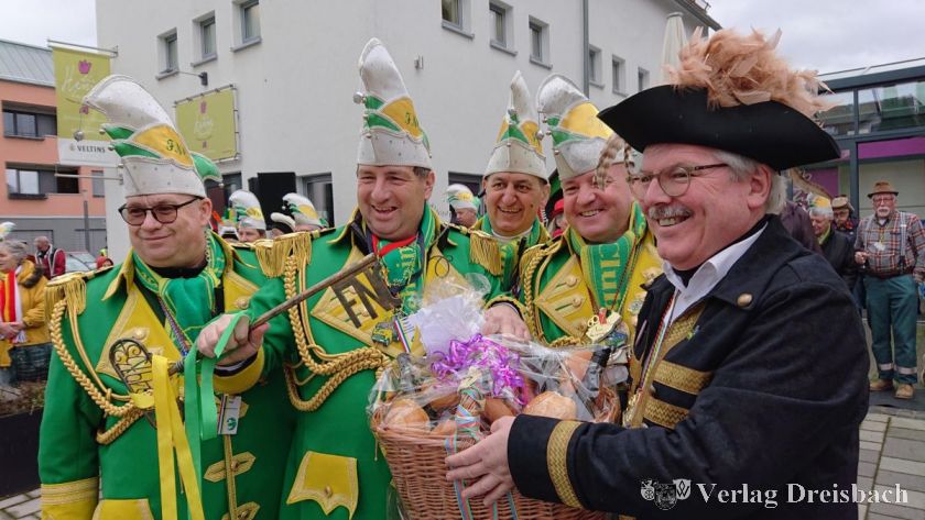 Nach der Arbeit kommt stets das Vergnügen, das mit einem Korb voller Weck, Worscht unn Woi gesichert war. Es sollte ja schließlich beim Umzug niemand Hunger leiden. Nachdem alle traditionellen Reglementarien erledigt waren, konnte um 13.31 Uhr der traditionelle Umzug durch Flörsheims Straßen starten, zu dem tausende Besucher erwartet wurden. Hier und alleweil: Flerschem – Hall die Gail!